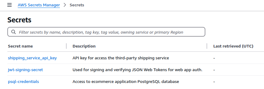 In the AWS Secrets Manager dashboard, navigate to the Secrets menu to review your existing secrets and their descriptions.